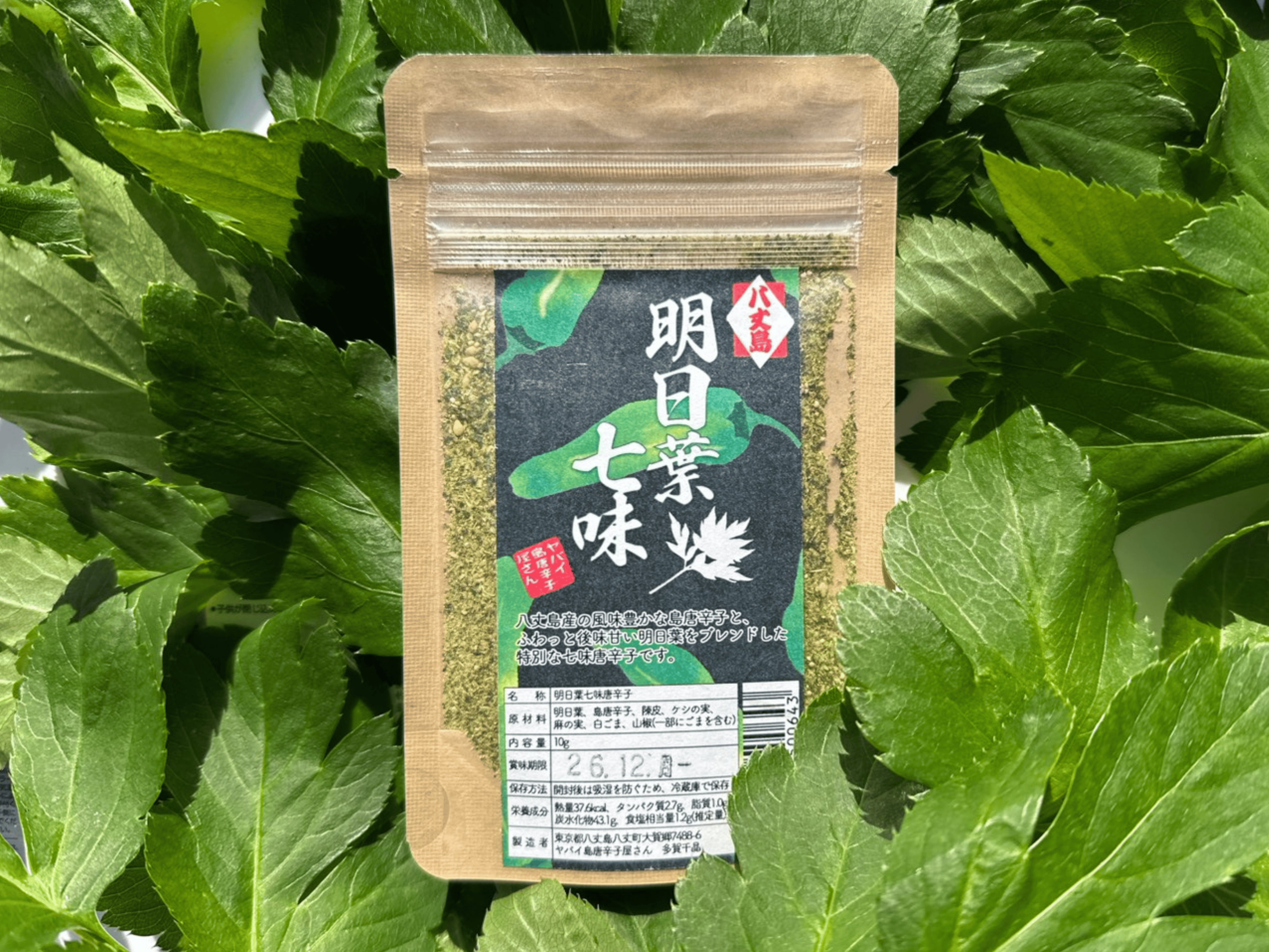 八丈島原産地の明日葉と、私が畑で育てた島唐辛子をブレンドした珍しい緑色の七味です。